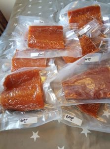 Da er laksesesongen definitivt ferdig, selv om vi tar oss en tur i elva for å se til laksen. Nå er det veldig mye aktivitet og nytt liv skapes for fremtidige laksefiskere. Sammen står de, to og to, kanskje med bortiblanding av andre og reviret passes på, mens hoene graver ivrig i elvegrusen hvor rogn plasseres og hannen gjør sin jobb. Da er det bare å håpe at jobben er velgjort og at fremtidig yngel klarer seg mot alle fare som lurer. Fra Rogn til tilbakevendende laks for gyting er frafallet stort. Nå var det ikke det dette skal handle om. Nå har vi kommet dit at fangsten skal videreforedles til røykelaks. Vi har satt av tre lakser til dette. 5,0, 7,0 og 10,6 kilo rund fisk. Laksen har jeg allerede filetert. Dette gjør jeg samme dag som fiske er fanget. Bruker to brødposer, en fra hver ende til å legge de i før de havner i fryseboksen på ei fjøl. På denne måten tar laksen minst mulig plass i fryseboksen som vi aktiv bruker til lagring av annet mat som hjemmebakt brød og andre matvarer. Nå er det jeg som forvalter alt i fryseboksen siden jeg er hjemmeværende og kona jobber, men det blir litt ugreie viss det oppstår kaos i fryseboks og fryseskap.